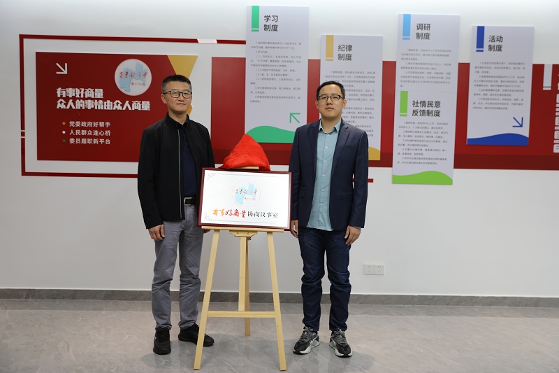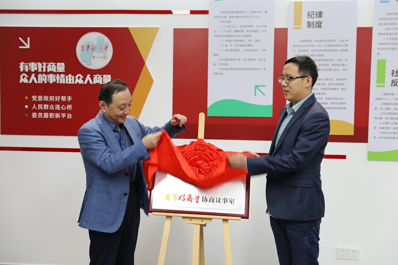随后,大家来到协商议事室,在考察团的见证下,区政协魏敏主席、区工信局局长杨波共同为一步干燥“有事好商量”协商议事室揭牌。