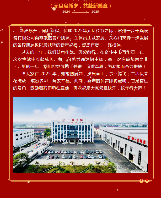 新岁序开,同赴新程。值此2025年元旦佳节之际,常州一步干燥设备有限公司向尊敬的客户朋友、全体员工及家属、关心和支持一步发展的各界朋友致以最诚挚的新年祝福,感恩有您,一路相伴。 过去的一年,我们并肩作战、勇毅前行,在奋斗中书写华章,在一次次挑战中收获成长。…