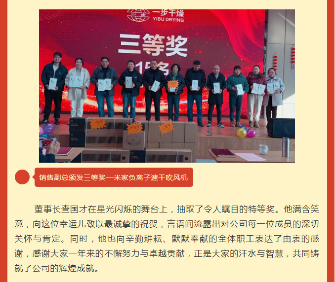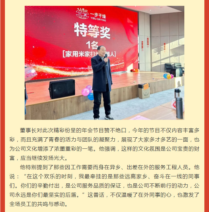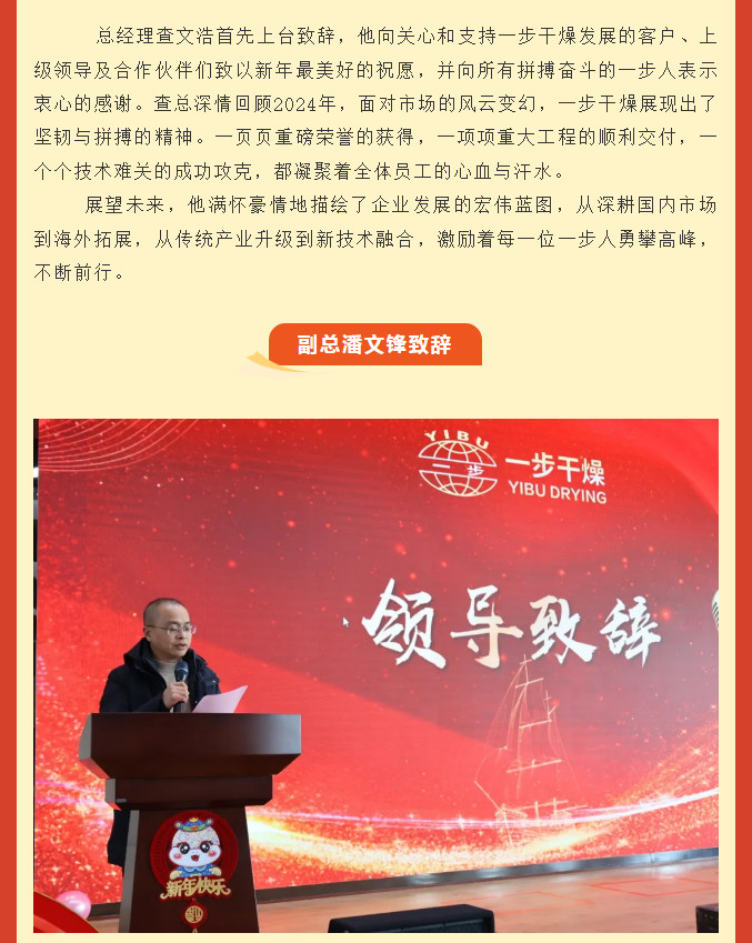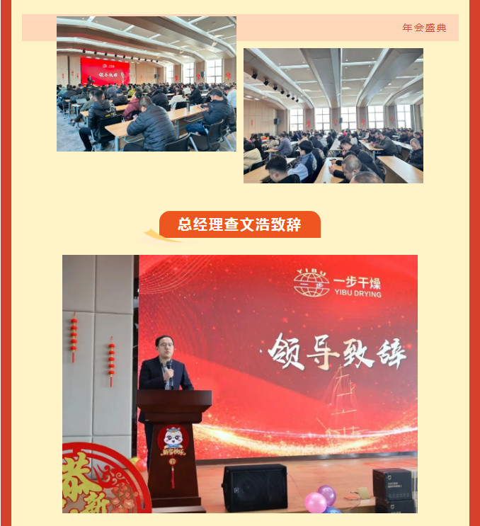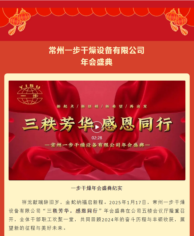 祥龙献瑞辞旧岁,金蛇纳福启新程。2025年1月17日,常州一步干燥设备有限公司“三秩芳华,感恩同行”年会盛典在公司五楼会议厅隆重召开,全体干部职工欢聚一堂,共同回顾2024年的奋斗历程与丰硕收获,展望新的征程与美好未来。