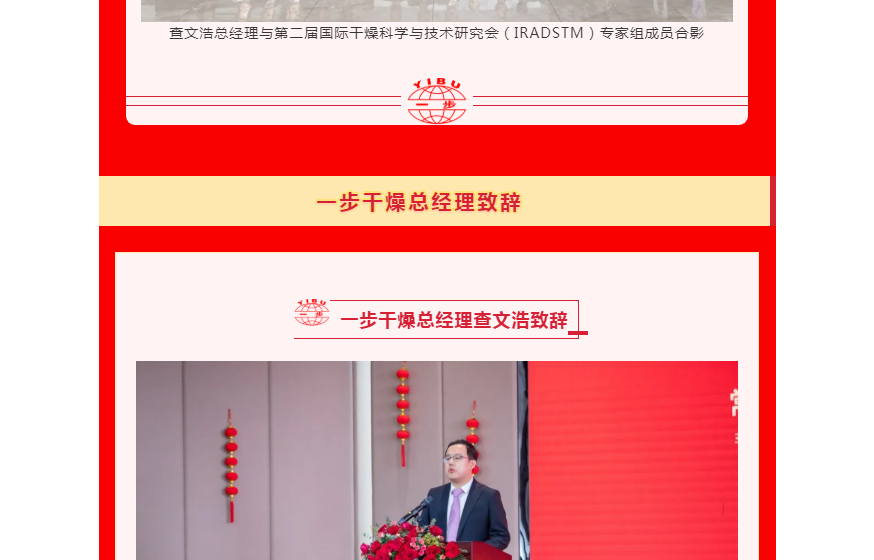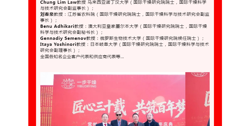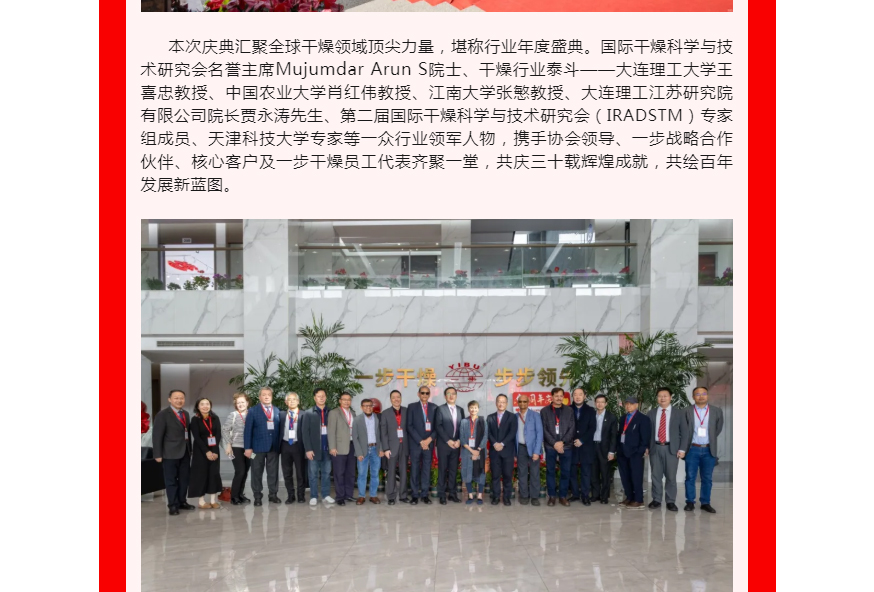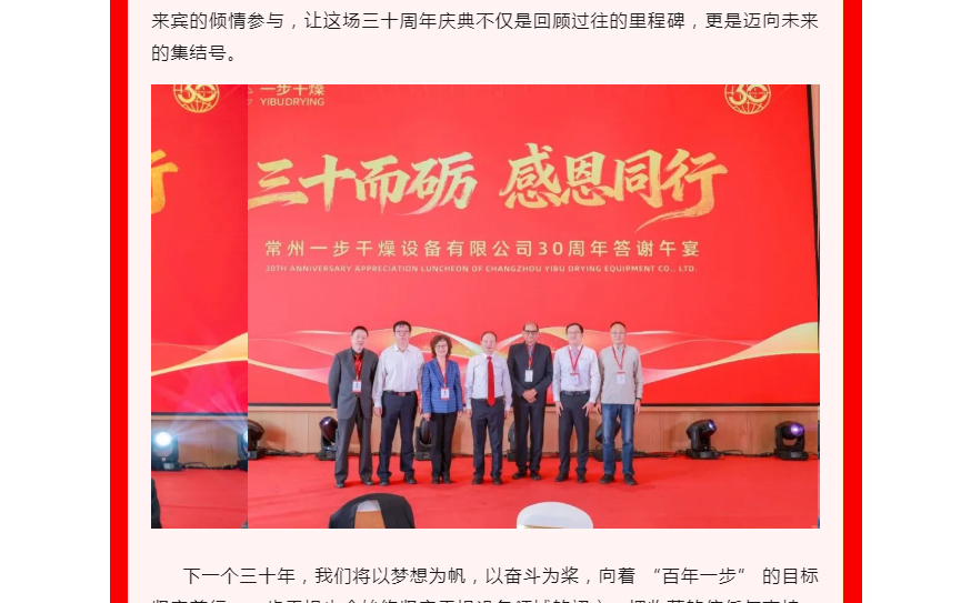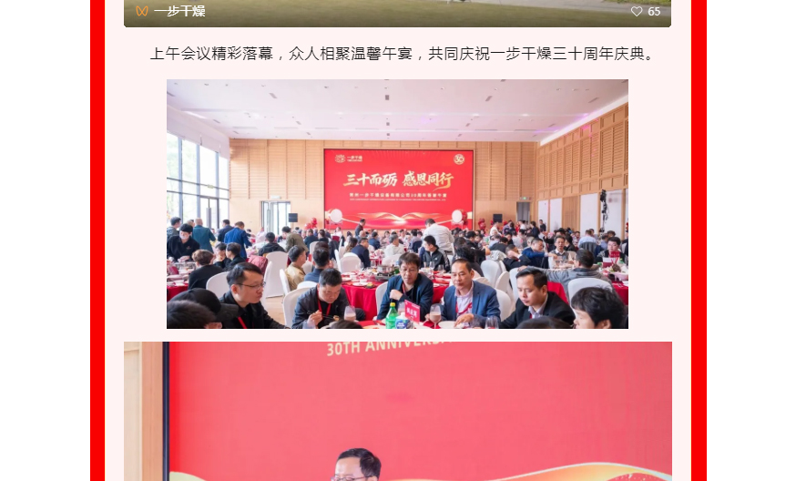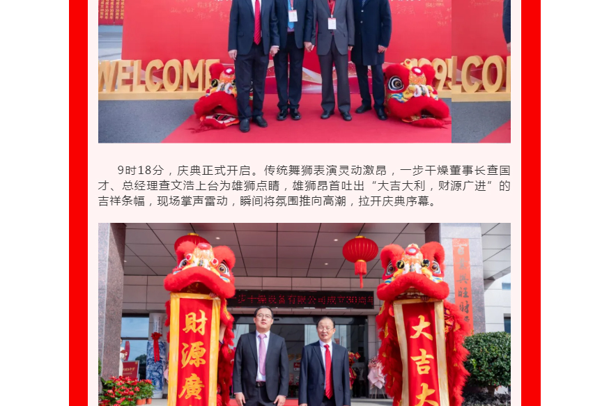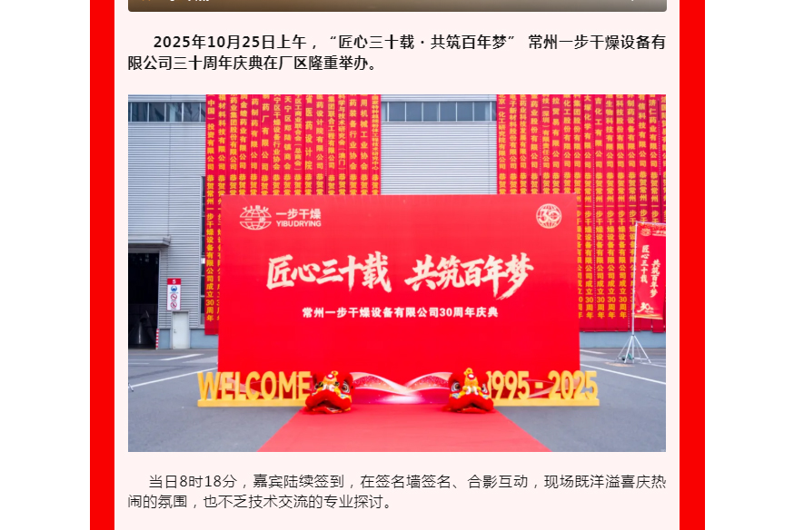 2025年10月25日上午,“匠心三十载・共筑百年梦” 常州一步干燥设备有限公司三十周年庆典在厂区隆重举办。嘉宾陆续签到,在签名墙签名、合影互动,现场既洋溢喜庆热闹的氛围,也不乏技术交流的专业探讨。庆典正式开启。传统舞狮表演灵动激昂,一步干燥董事长查国才、总经理查文浩上台为雄狮点睛,雄狮昂首吐出“大吉大利,财源广进”的吉祥条幅,现场掌声雷动,瞬间将氛围推向高潮,拉开庆典序幕。