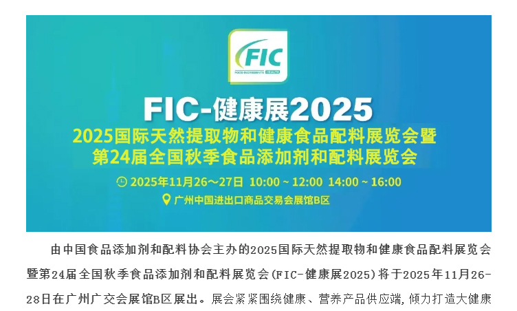 由中国食品添加剂和配料协会主办的2025国际天然提取物和健康食品配料展览会暨第24届全国秋季食品添加剂和配料展览会(FIC-健康展2025)将于2025年11月26-28日在广州广交会展馆B区展出。展会紧紧围绕健康、营养产品供应端,倾力打造大健康产业一站式采购服务平台,助力大健康产业从源头保证质量,良性有序发展壮大。常州一步干燥设备有限公司应邀参加本次盛会,展位号B9.1馆9D30/9F29,请锁定 FIC - 健康展 2025,期待与您在广州相遇,共话健康食品新未来!