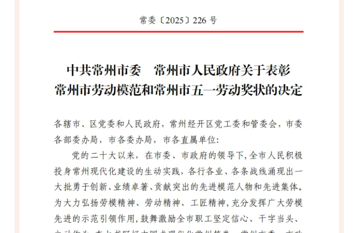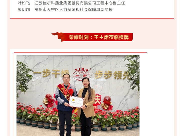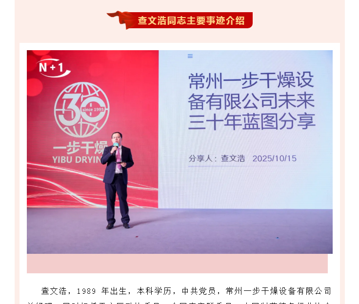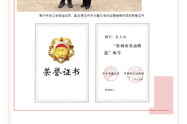 近日,常州市劳动模范和五一劳动奖状评选表彰结果揭晓,常州一步干燥设备有限公司总经理查文浩脱颖而出,被授予“常州市劳动模范”称号。2025年12月19日,常州市总工会党组成员、副主席王丹丹一行莅临企业授牌并开展座谈会。