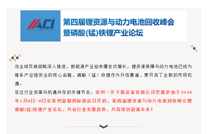 当全球双碳战略深入推进,新能源产业迎来爆发式增长,锂资源保障与动力电池已成为维系产业链安全的核心命题,磷酸(锰)铁锂作为升级赛道,更开启了全新的市场机遇。在这行业变革与机遇并存的关键节点,常州一步干燥设备有限公司受邀参加于2026年1月8日-9日在常州富都洲际酒店召开的,第四届锂资源与动力电池回收峰会暨磷酸(锰)铁锂产业论坛,共话行业发展趋势,共筑绿色能源未来!