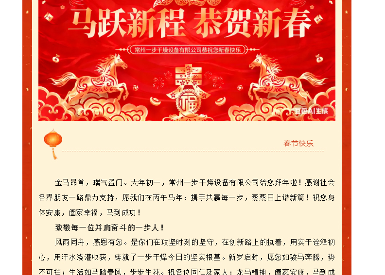 金马昂首,瑞气盈门。大年初一,常州一步干燥设备有限公司给您拜年啦!感谢社会各界朋友一路鼎力支持,愿我们在丙午马年:携手共赢每一步,蒸蒸日上谱新篇!祝您身体安康,阖家幸福,马到成功!