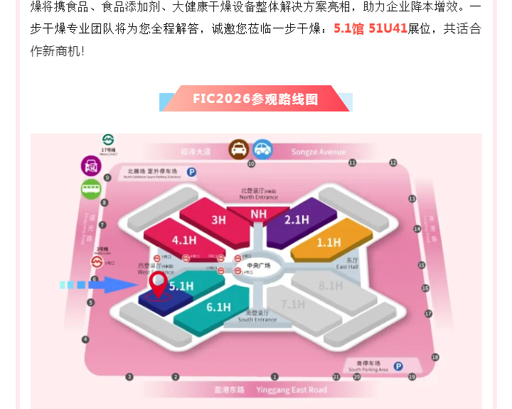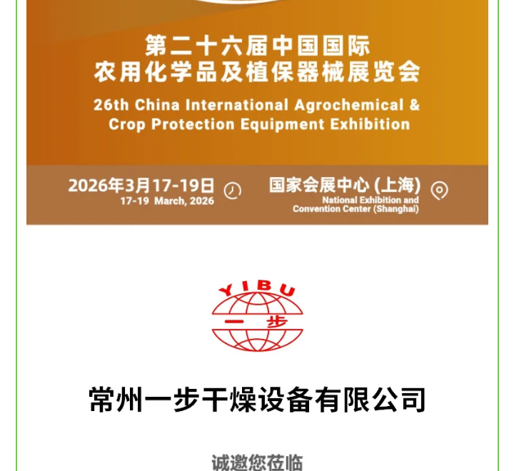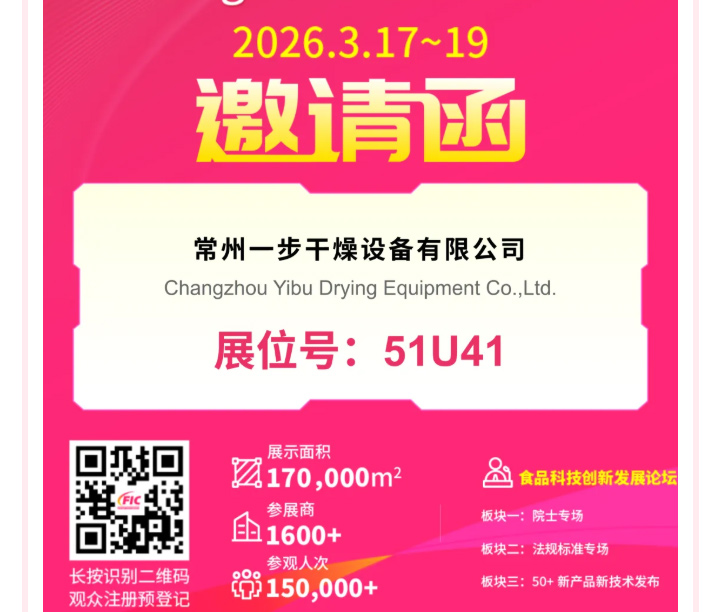春启新程,智汇上海!由中国食品添加剂和配料协会主办的第二十九届中国国际食品添加剂和配料展览会(FIC 2026),将于2026年3月17-19日在国家会展中心(上海)启幕,展会聚焦食品工业的创新发展,打造一站式采购平台。作为深耕干燥设备30余年的国家专精特新小巨人企业、国家高新技术企业,一步干燥将携食品、食品添加剂、大健康干燥设备整体解决方案亮相,助力企业降本增效。一步干燥专业团队将为您全程解答,诚邀您莅临一步干燥:5.1馆 51U41展位,共话合作新商机!