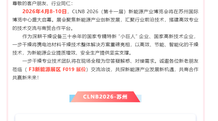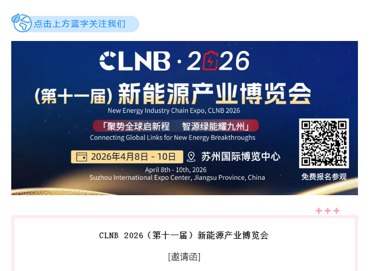 尊敬的客户朋友、行业同仁:2026年4月8-10日,CLNB 2026(第十一届)新能源产业博览会将在苏州国际博览中心盛大启幕。展会聚焦新能源产业创新发展,汇聚行业前沿技术,搭建高效专业的技术交流与商贸合作平台。