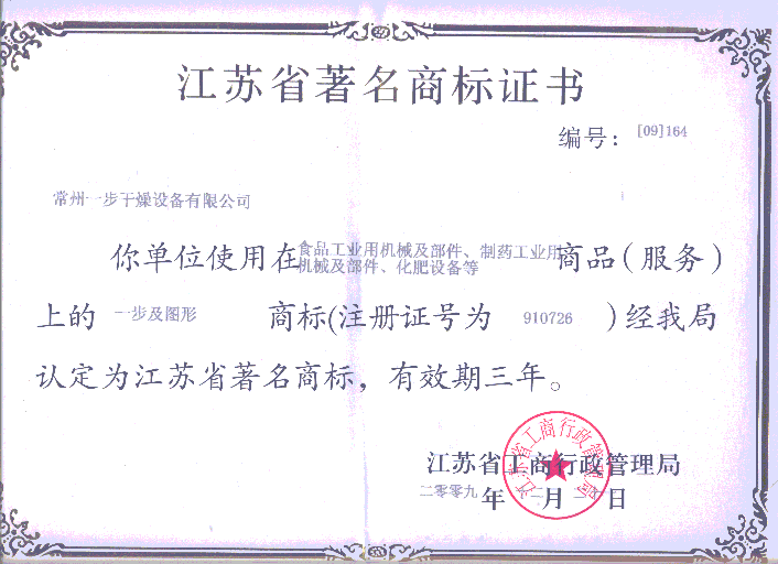 “一步”商标象征着常州一步干燥设备有限公司的信誉、产品质量和市场占有率。“一步”商标既是客户认购我公司产品的标志,又是我公司推销产品、树立信誉和开拓市场的重要工具。只有对“一步”商标的精心培育管理,才能使其声誉长盛不衰。正是在这样的理念下,一步人孜孜以求,通过实施品牌质量战略、新产品新技术战略以及广告战略,使“一步”商标连续三次荣获“江苏省著名商标”、“常州市知名商标”,与此同时,“一步”商标在香港注册成功,也为企业竞争增加了新的砝码,增添了企业的无形资产。