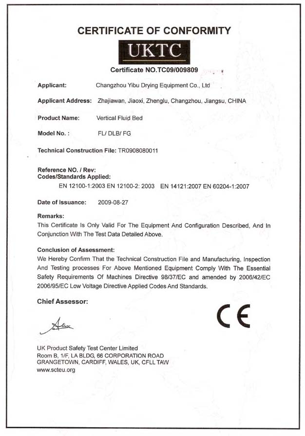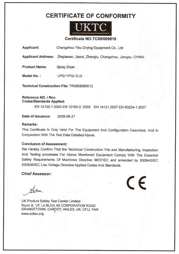 日前,我公司的产品沸腾制粒干燥机(FL/DLB/FG)、离心喷雾干燥机(LPG/YPG/ZLG)以及浆叶干燥机(QJ)通过了安全、环保、卫生等各项指标测定,获得欧盟认证机构颁发的CE认证证书,取得了进入欧洲联盟市场的销售通行证。这标志着常州一步产品达到欧盟指令性要求,实现了与欧洲和国际标准的接轨。