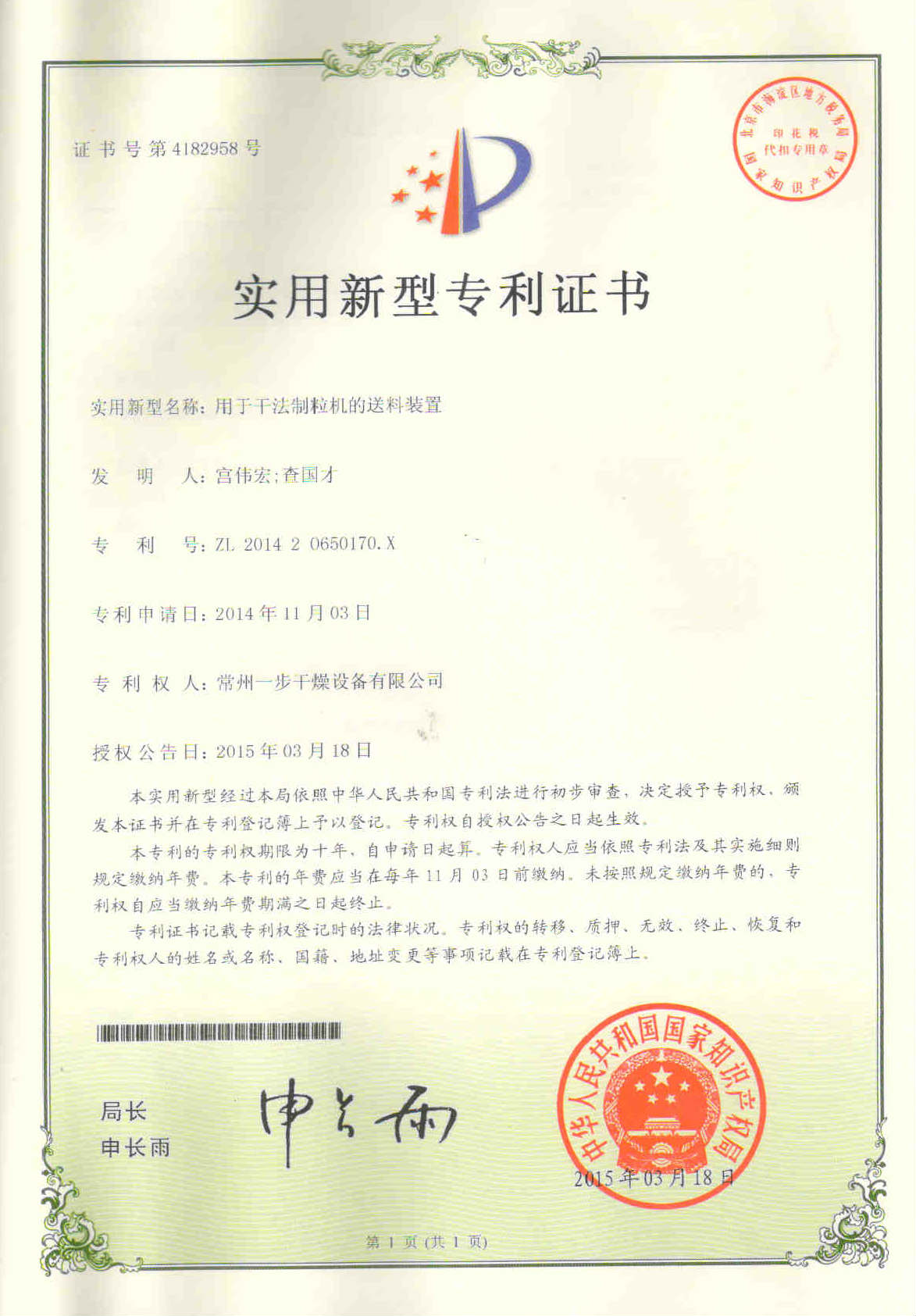 干法制粒机是常州一步公司精心研制开发的一种节能环保型产品。日前,其关键部件挤压装置、送料装置的创新技术得到了国家知识产权局的授权,喜获二项专利,专利号分别为:ZL201420673874.9、ZL201420650170.X。